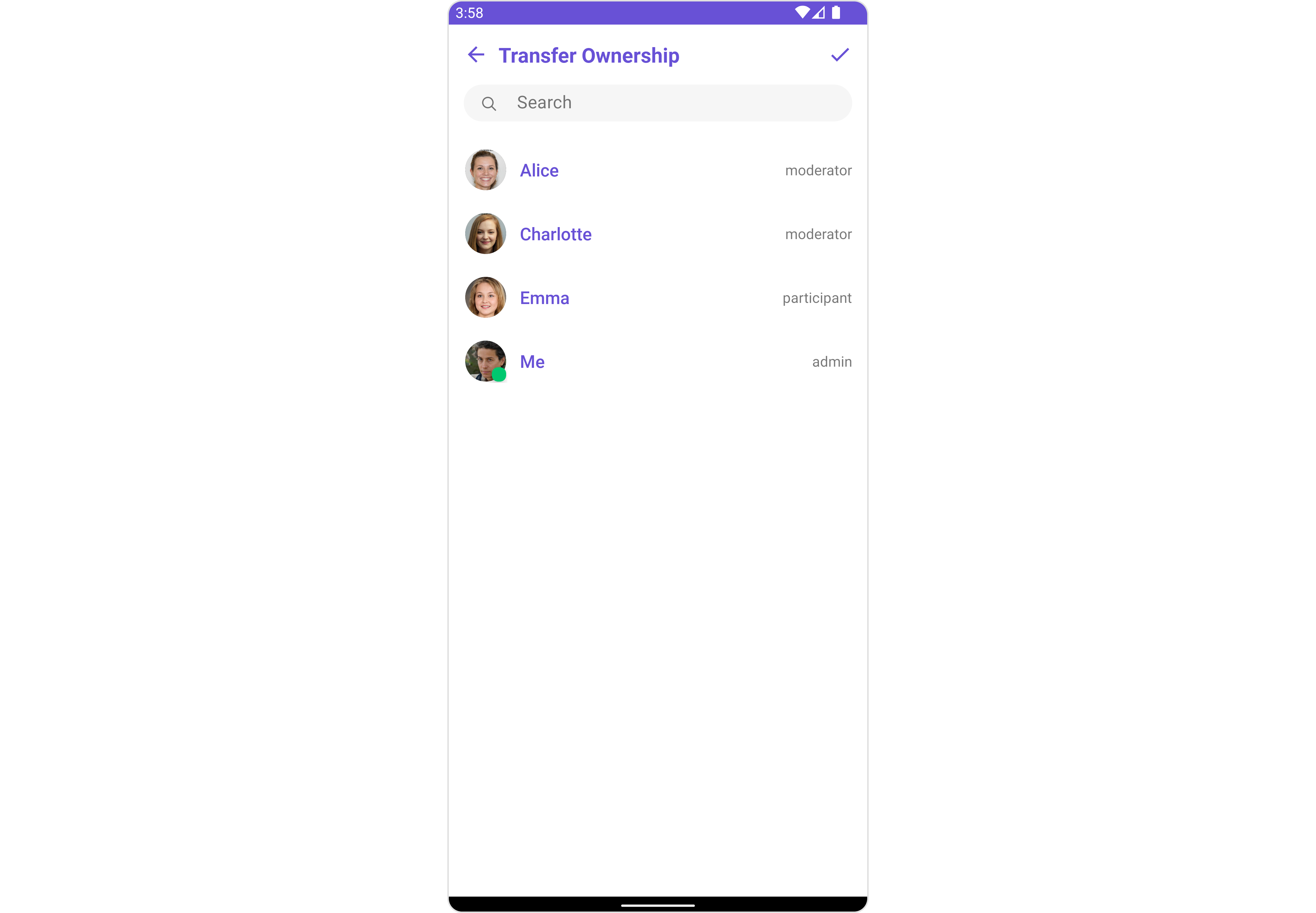 | CometchatGroupMembers | CometChatGroupMembers is an independent component designed to create a user-friendly screen for browsing and managing group members. Users can effortlessly search for specific members and transfer ownership |