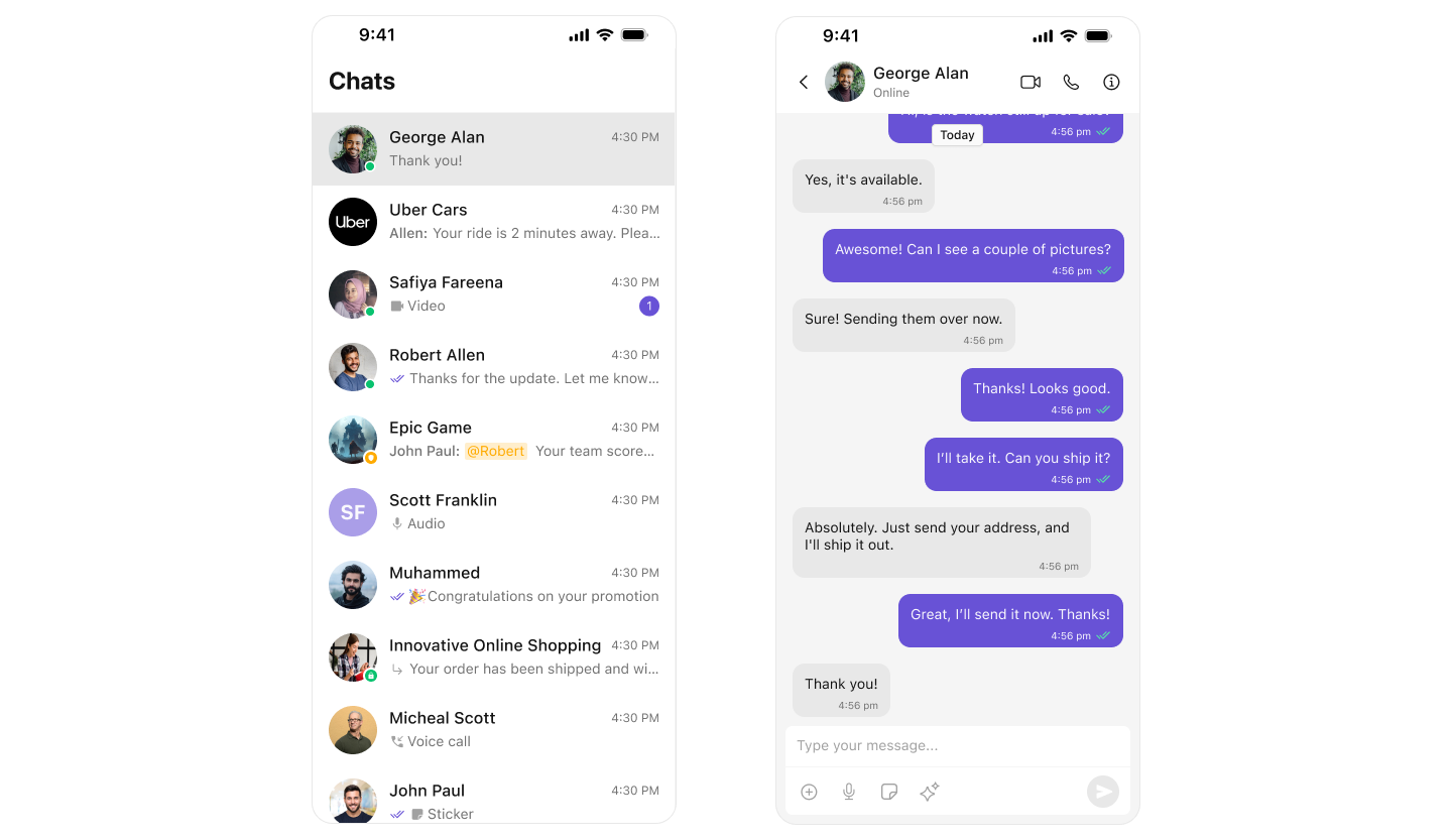 Best for: Native iOS apps using stack-based navigation to switch between conversations and messages. Highlights:- Push-Based Navigation – Taps on conversations open full message views.